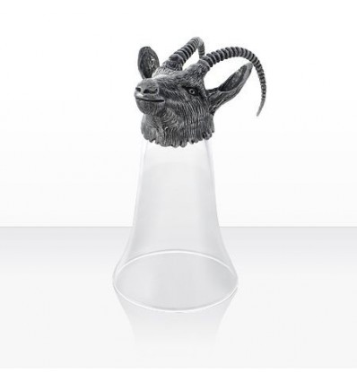 Чаша за аперитив/ракия/ от кристално стъкло с оригинална визия-глава на животно, изработена от сребро и калай. Предлага се в бяла картонена кутия Произведена в Португалия от „Freitas & Dores“.