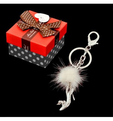 Модерен дамски ключодържател с пух от естествен косъм и кристали. Подходящ аксесоар за дамска чанта и раница. Ключодържателят е с формата на малка дамска елегантна обувчица с нежно пухче, в комбинация с кристали. Ключодържателят е с дължина 13,5см. Цената включва луксозна подаръчна кутия с размери 8,8см. х 8,8см., височина 6см. Прекрасен подарък за любим човек.