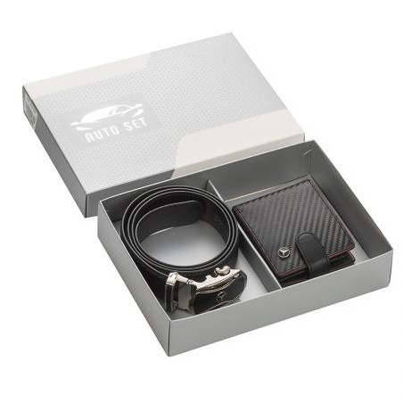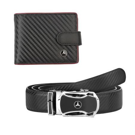 Луксозен подаръчен комплект от естествена кожа, съдържащ портфейл и колан с лого Mercedes - карбон. Портфейла съдържа отделения за банкноти, отделения за карти и лични документи, вътрешен монетник . Размер на портфейла: 9 x 11.5 x 2 см. Дължина на колана 110 см