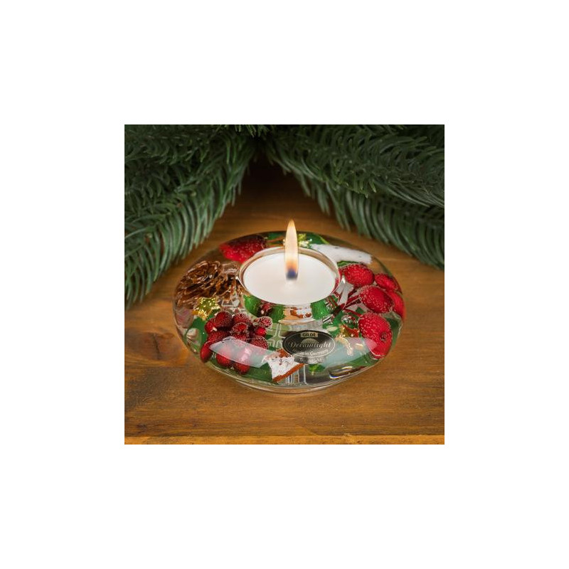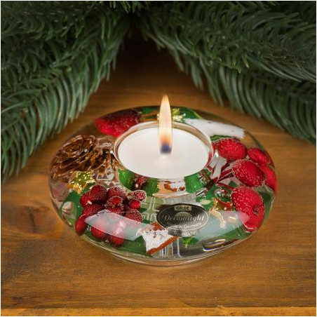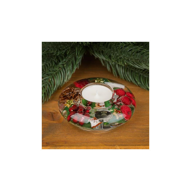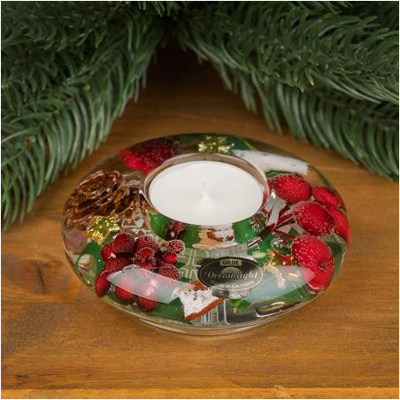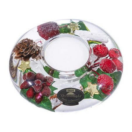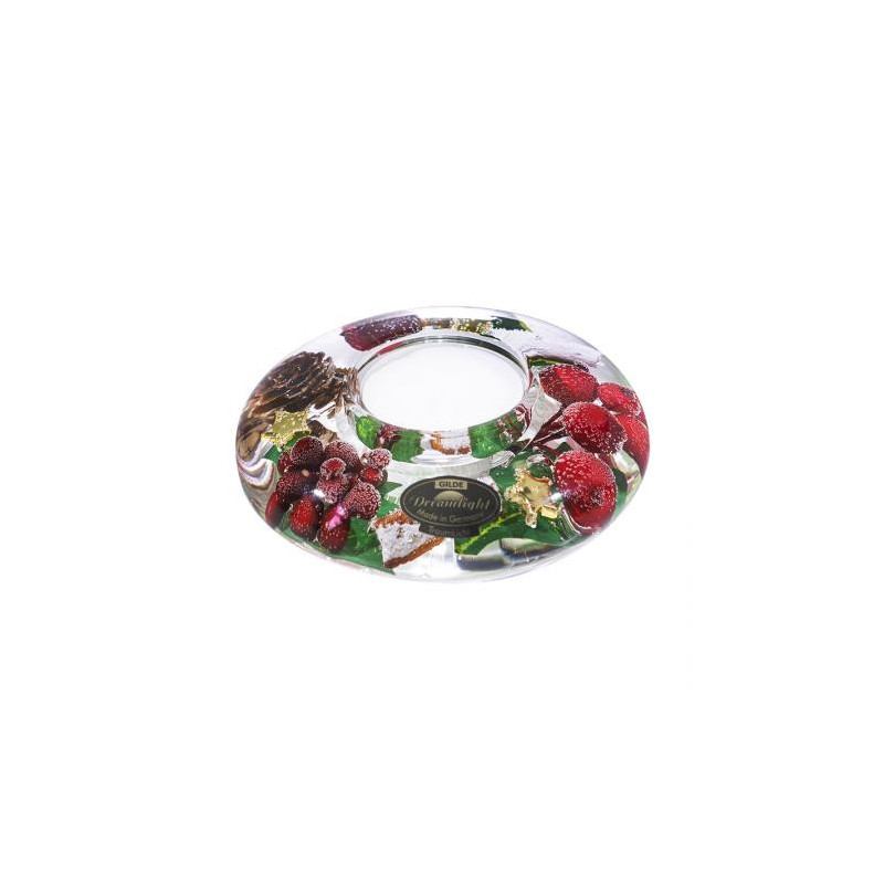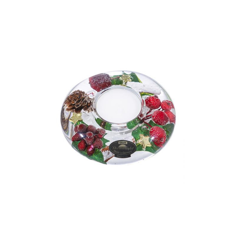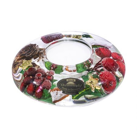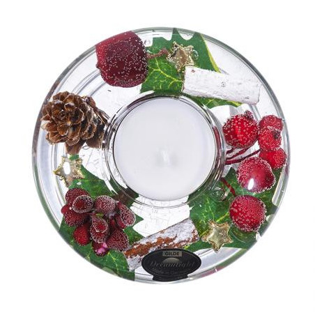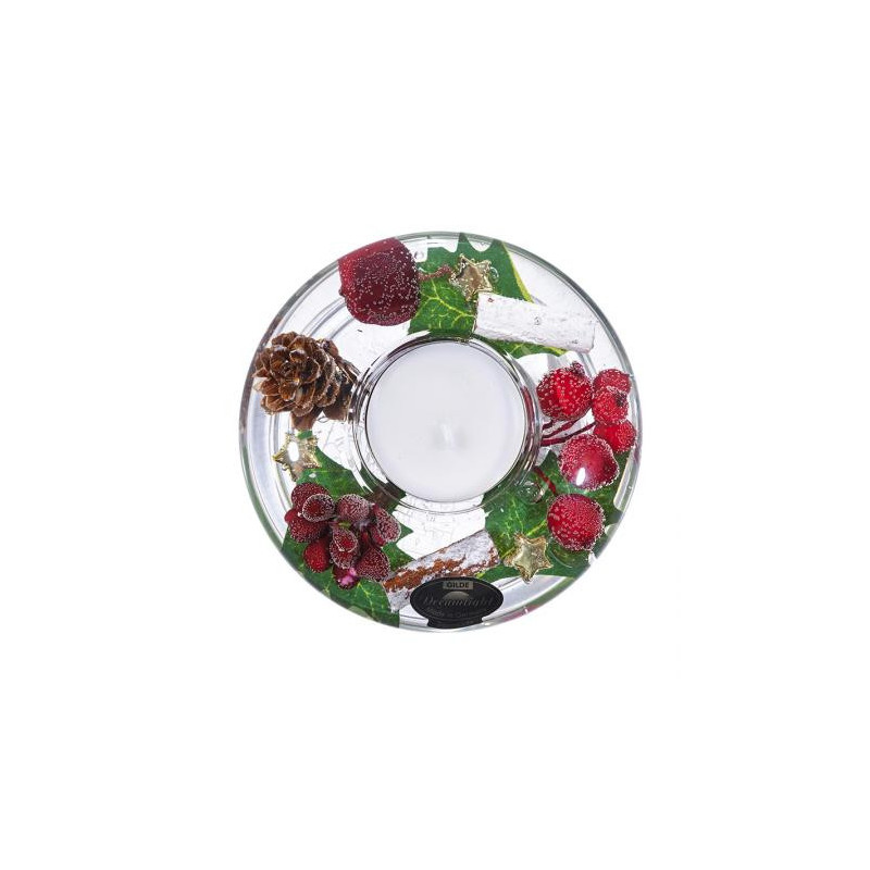 Стъклен свещник с красива коледна вътрешна декорация. Включва чаена свещ. Размери: 9.5 х 9.5 х 3.5 см.