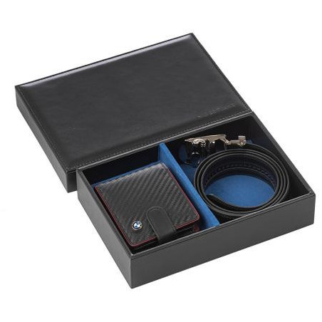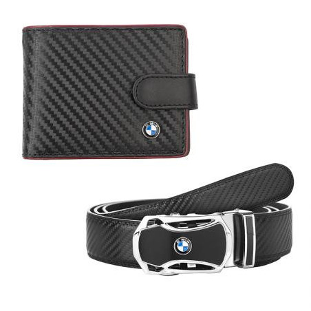 Луксозен подаръчен комплект от естествена кожа, съдържащ портфейл и колан с лого BMW - карбон. Портфейла съдържа отделения за банкноти, отделения за карти и лични документи, вътрешен монетник . Размер на портфейла: 9 x 11.5 x 2 см. Дължина на колана 110 см