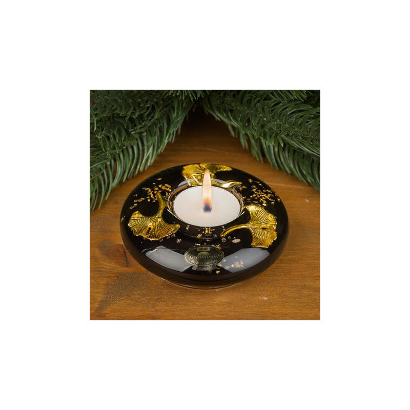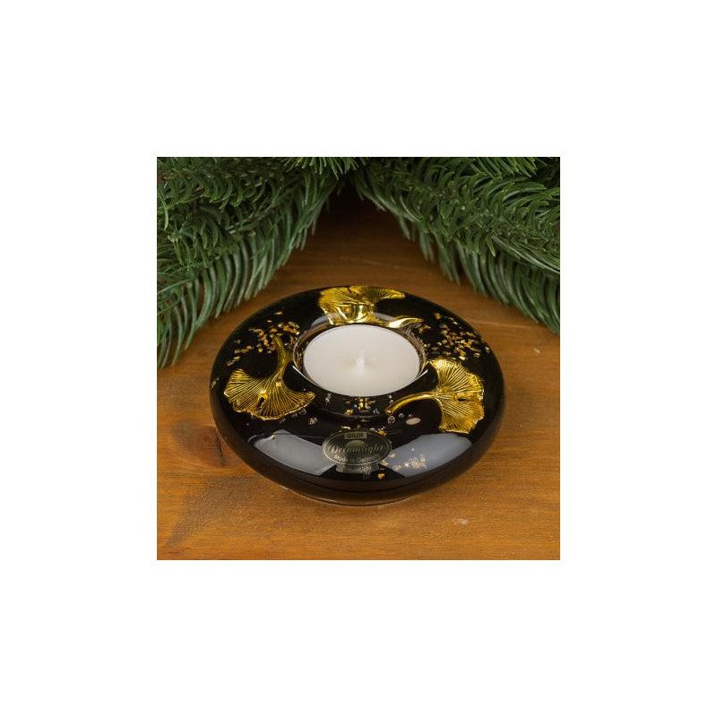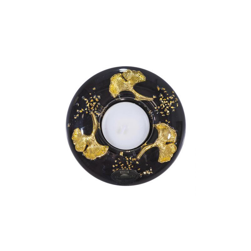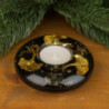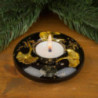 Стъклен свещник с красива коледна вътрешна декорация. Включва чаена свещ. Размери: 9.5 х 9.5 х 3.5 см.