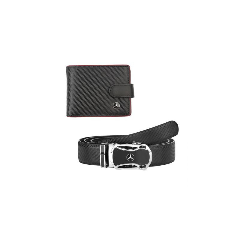Луксозен подаръчен комплект от естествена кожа, съдържащ портфейл и колан с лого Mercedes - карбон. Портфейла съдържа отделения за банкноти, отделения за карти и лични документи, вътрешен монетник . Размер на портфейла: 9 x 11.5 x 2 см. Дължина на колана 100 см