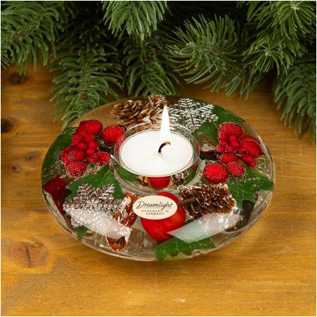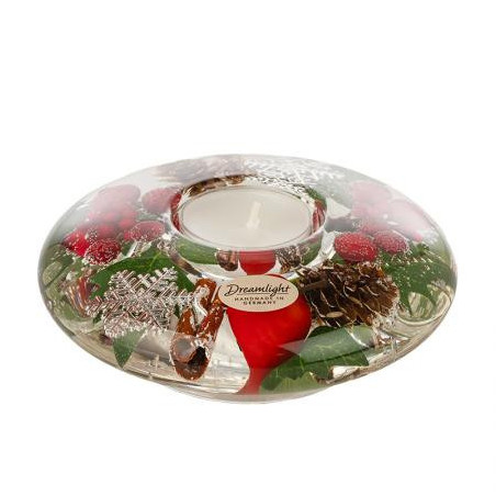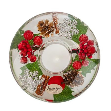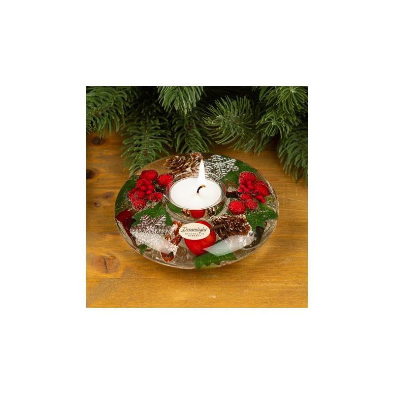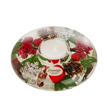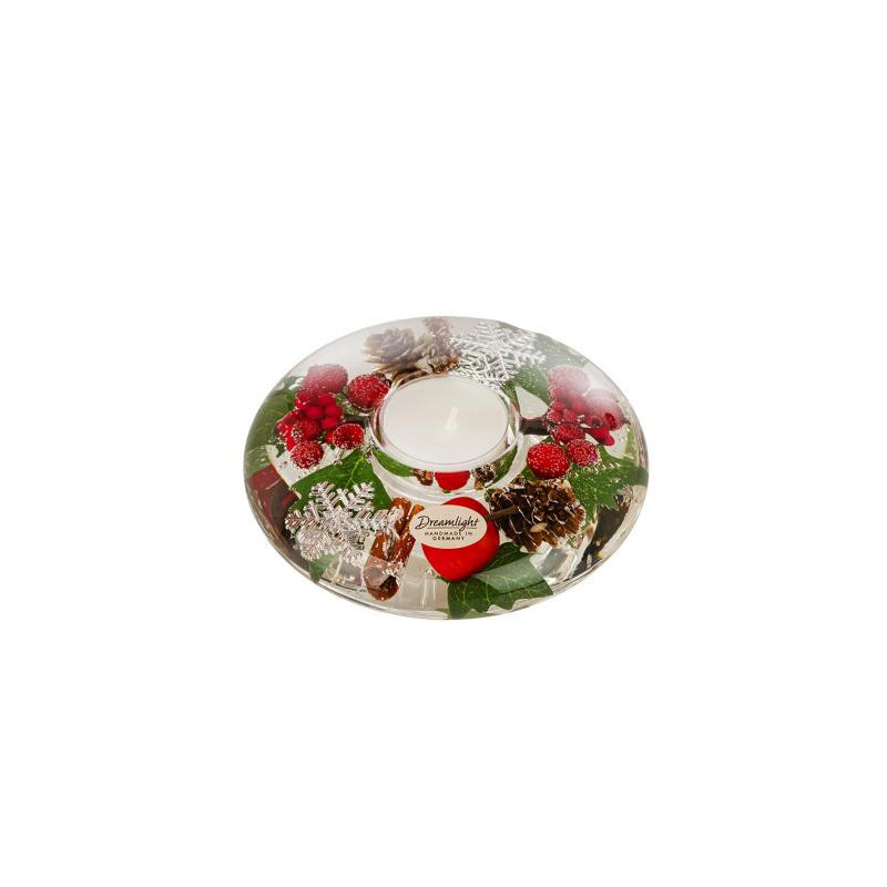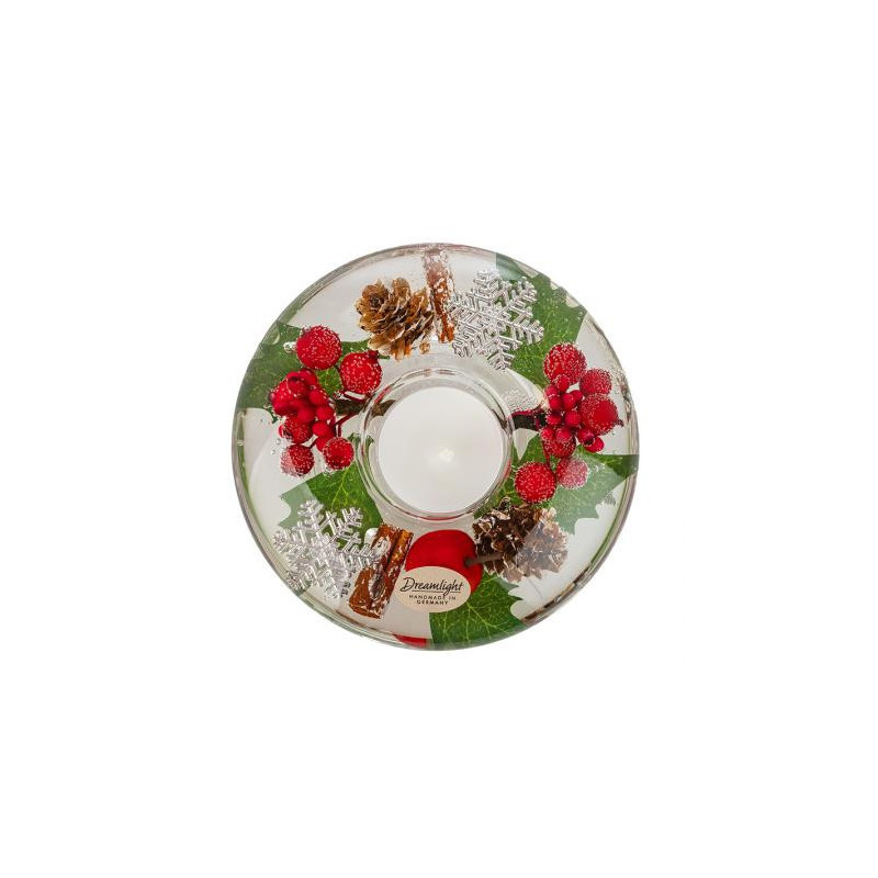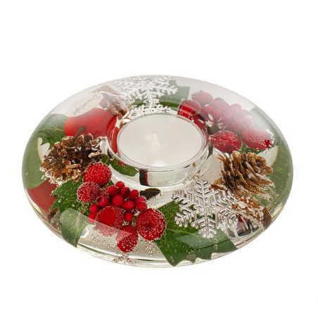 Стъклен свещник с красива коледна вътрешна декорация. Включва чаена свещ. Размери: 5 х 12 см