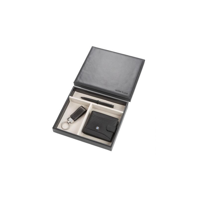 Стилен подаръчен сет в луксозна кутия, включващ химикалка, портфейл и ключодържател с лого на BMW. Размери на портфейла: 9 x 11 см