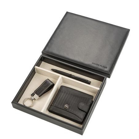Стилен подаръчен сет в луксозна кутия, включващ химикалка, портфейл и ключодържател с лого на Audi. Размери на портфейла: 9 x 11 см