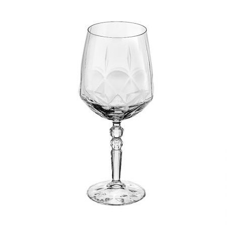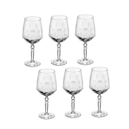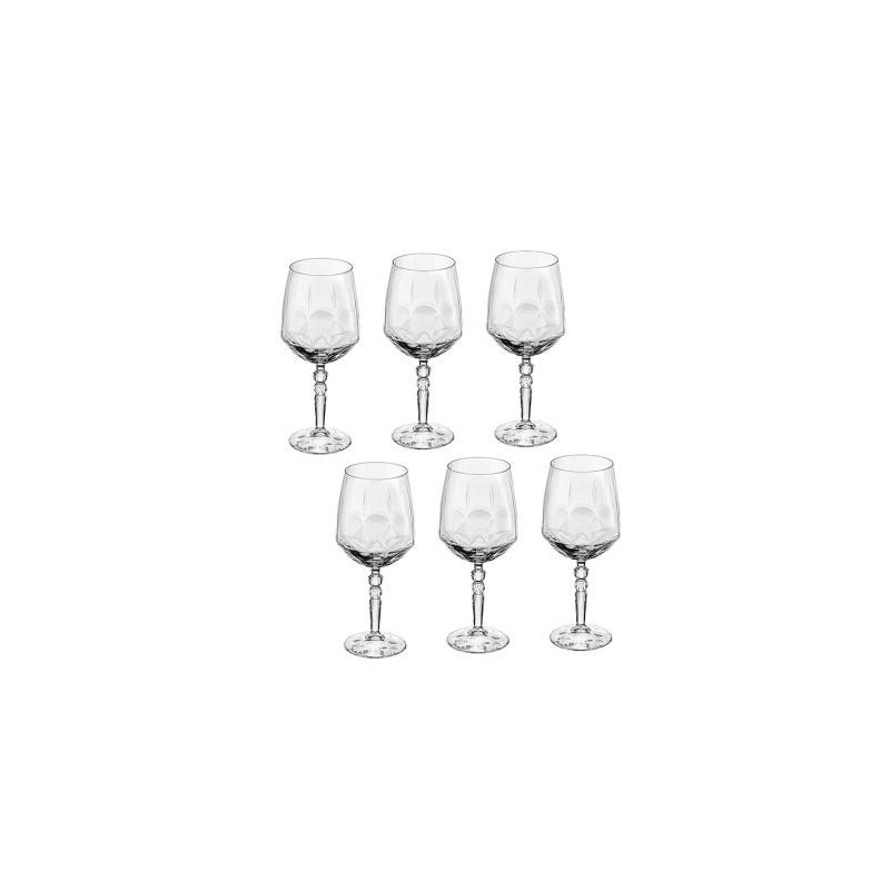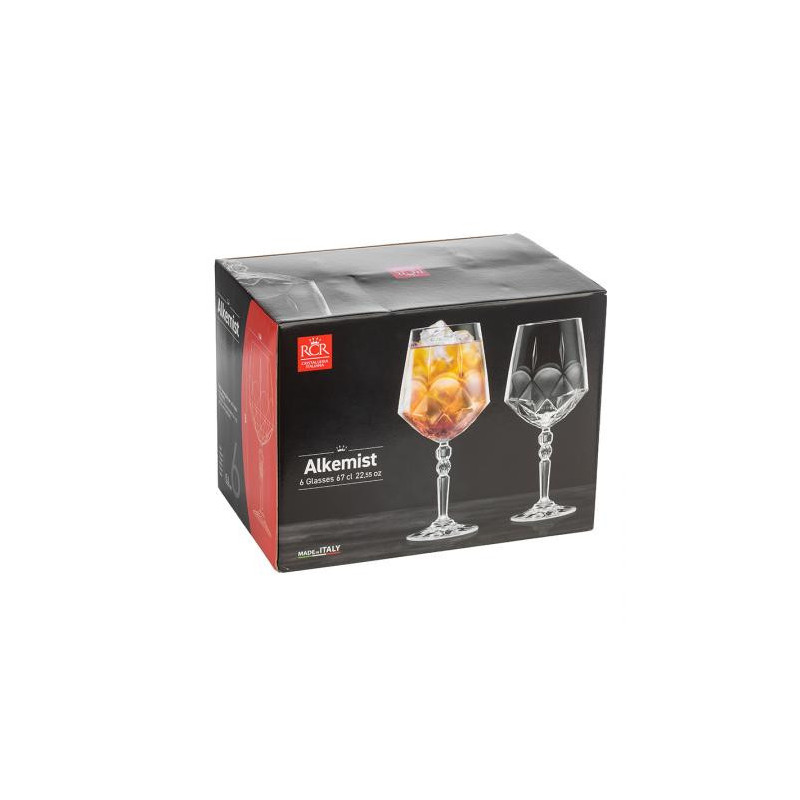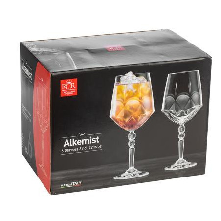 Чаши: Ø 10,4 см. Височина: 23,7 см. Вместимост: 670 мл. Стилен комплект от 6 чаши за вино, произведени от италианската фирма RCR Crystal. Чашите създават усещане за наслада от вкуса на виното с нестандартната си форма и изящен дизайн. Подходящи за почистване в съдомиялна машина. Подарете си финес и красота на масата с италианско качество.
