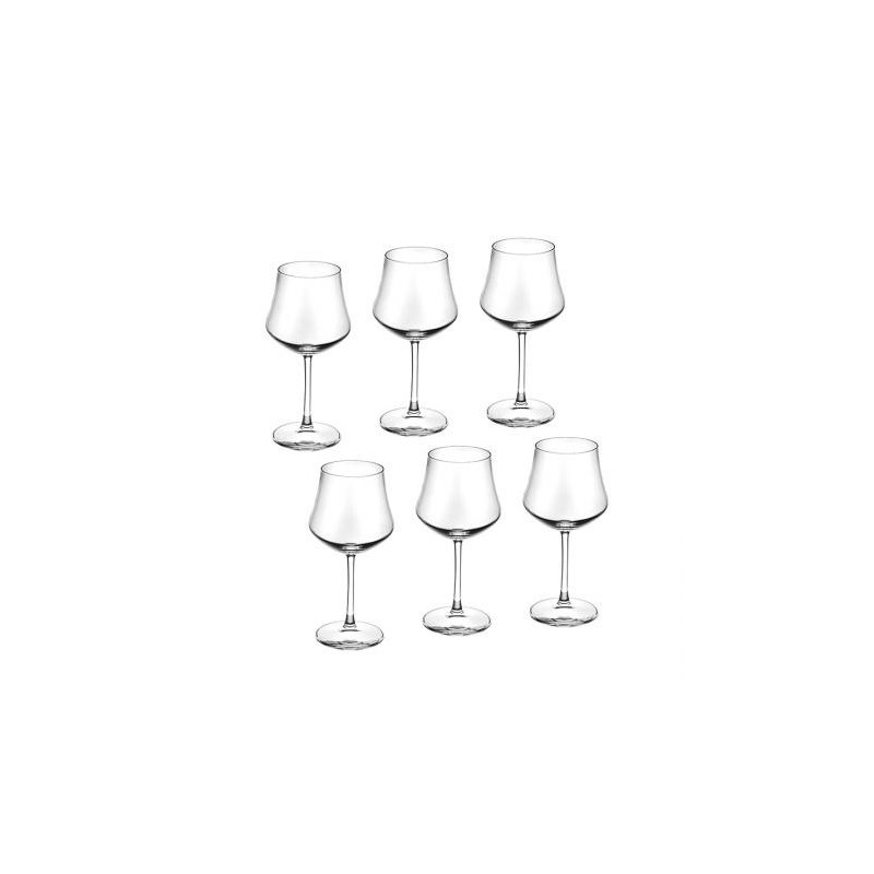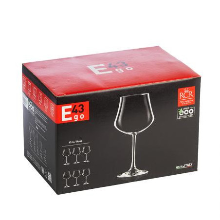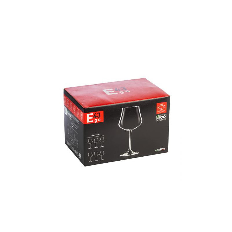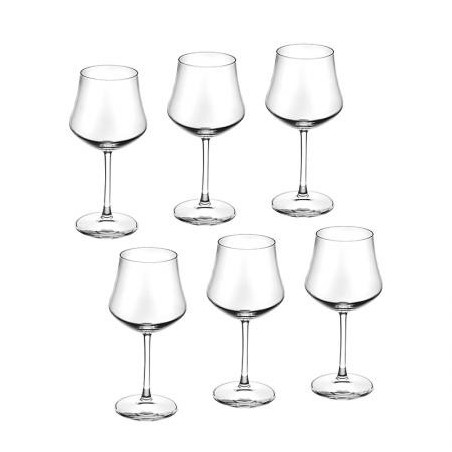 Чаши: Ø 10.0 см. Височина: 20,0 см. Вместимост: 430 мл. Стилен комплект от 6 чаши за вино, произведени от италианската фирма RCR Crystal. Чашите създават усещане за наслада от вкуса на виното с нестандартната си форма и изящен дизайн. Подходящи за почистване в съдомиялна машина. Подарете си финес и красота на масата с италианско качество.