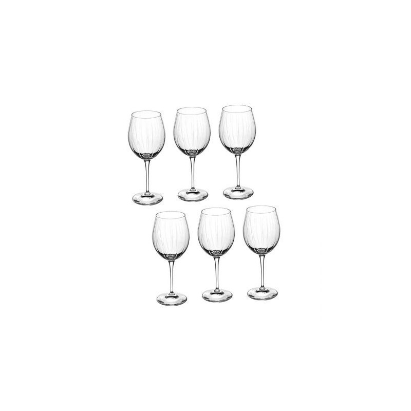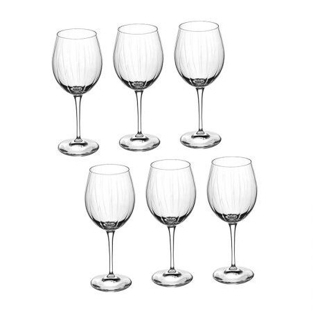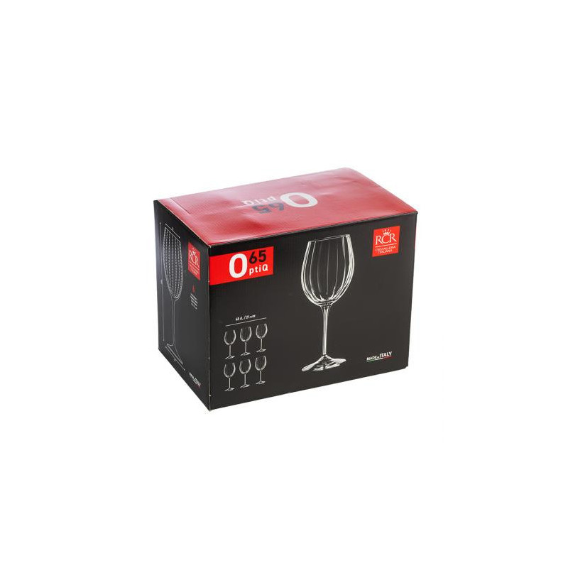 Чаши: Ø 10.0 см. Височина: 23.5 см. Вместимост: 650 мл. Стилен комплект от 6 чаши за вино, произведени от италианската фирма RCR Crystal. Чашите създават усещане за наслада от вкуса на виното с нестандартната си форма и изящен дизайн. Подходящи за почистване в съдомиялна машина. Подарете си финес и красота на масата с италианско качество.