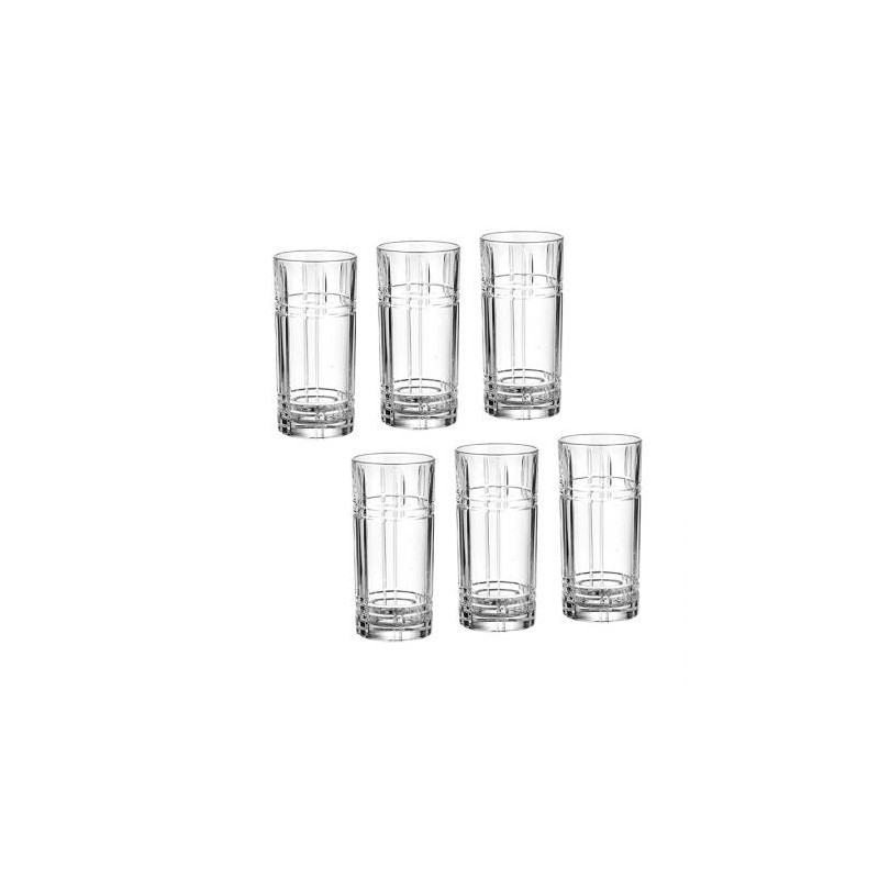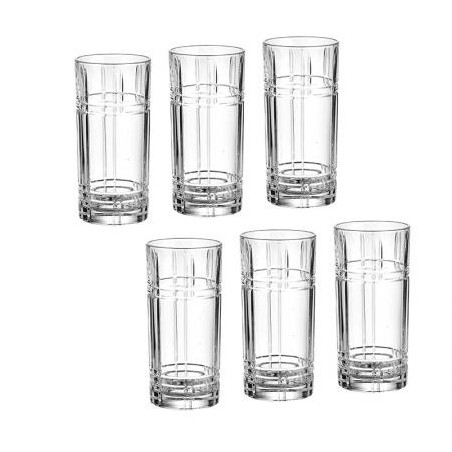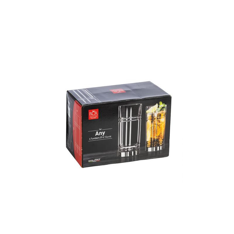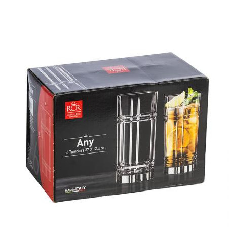 Чаши: Ø 7,0 см. Височина: 15,0 см. Вместимост: 370 мл. Стилен комплект от 6 чаши за безалкохолно, произведени от италианската фирма RCR Crystal. Подходящи за почистване в съдомиялна машина. Подарете си финес и красота на масата с италианско качество.